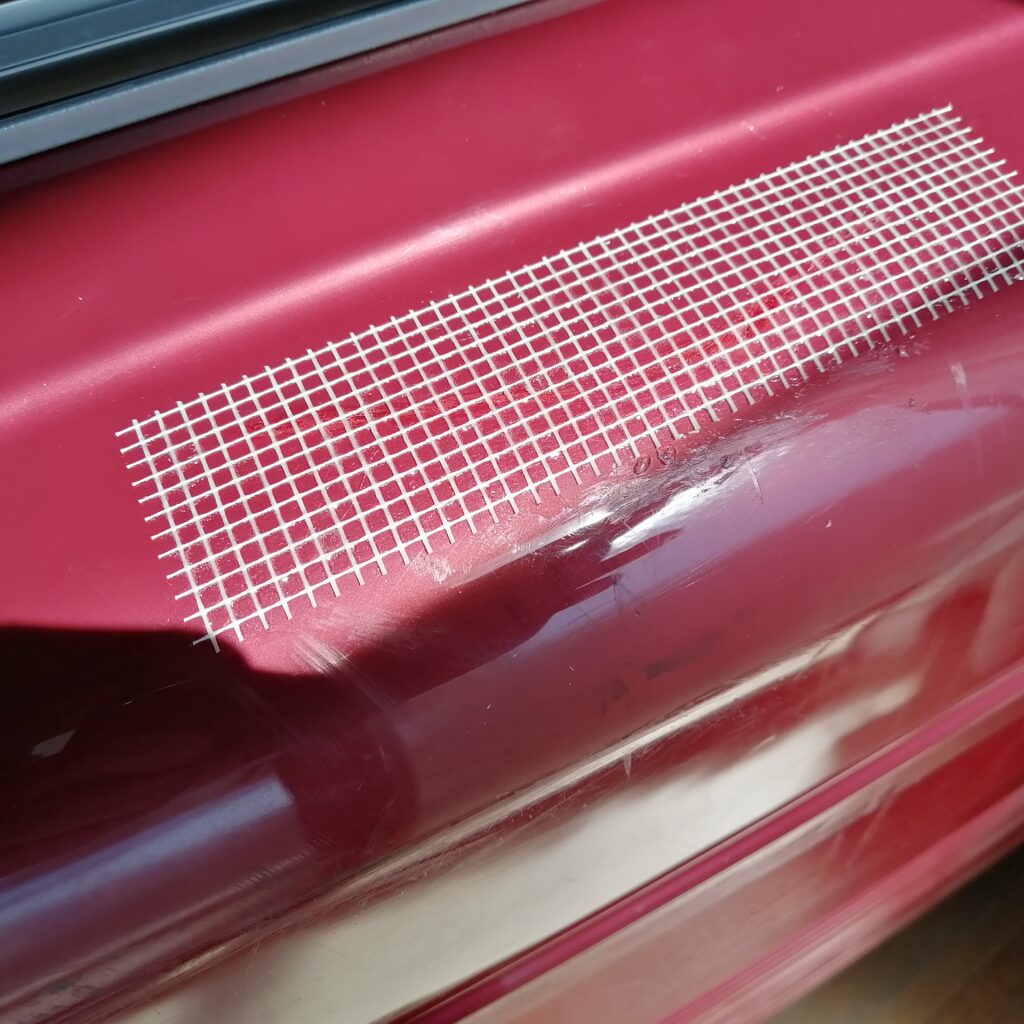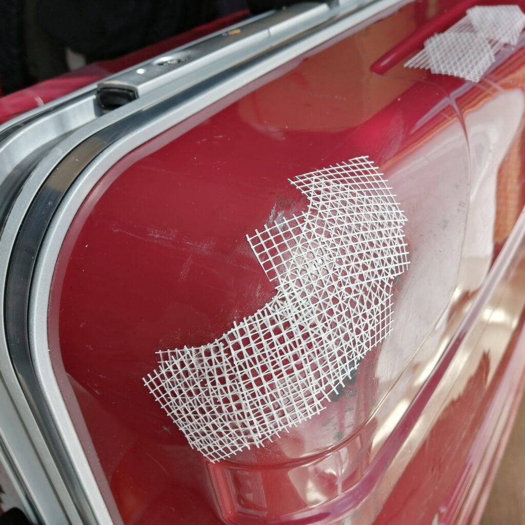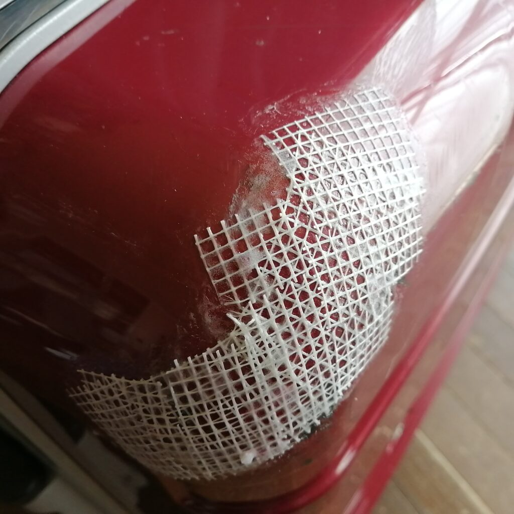 ポリカボディ補強メッシュテープで傷口をふさぐように貼ります。
